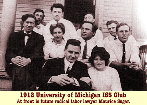 [fn. Max Horn, The Intercollegiate Socialist Society, 1905-1921, pp. 5-6.] 1. Organizational Meeting --- New York, NY --- September 12, 1905. The ISS was formally launced at a meeting held in the afternoon of Sept. 12, 1905 at Peck's Restaurant in downtown New York. More than 50 men and women were in attendance to give birth to the new organization, including such luminaries as Leonard Abbott, Mary Beard, Crystal Eastman, W.J. Ghent, and Gaylord Wilshire, in addition to a young Junior from Weslyan University named Harry Laidler. Upton Sinclair called the meeting to order. The gathering decided to accept the name "Intercollegiate Socialist Society" and to open membership to college students, teachers, or graduates. Students were to be organized into college chapters on each campus and the central organization was to be funded by these local groups remitting a percentage of the dues collected to the national society. Officers were to consist of a President, two Vice Presidents, a Secretary, and a Treasurer -- each elected annually by vote of the whole society. Governance was to be handled by these five officers and six additional members of an Executive Committee. Term of office was to begin in April of each year.