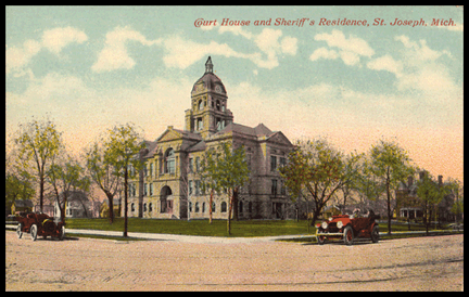 Berrien County Courthouse, St. Joseph, MI. [Circa 1910 postcard] *** PDF GRAPHICS FILE (420 k.) *** This postcard depicts the site of the sensational 1923 trials of William Z. Foster and C.E. Ruthenberg for having allegedly violated the Michigan "Criminal Syndicalism Law" by atttending the August 1922 convention of the Communist Party of America at Bridgman. The card notes that the courthouse was also the residence of the county sheriff. The old Berrien Co. Courthouse is no longer standing, having been removed to make way for a parking lot.
